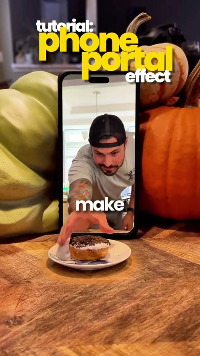 Beat 2 (0:00-0:03) — Process Teaser: This line explicitly outlines the two specific shots needed to create the effect: 'one of you reaching and grabbing your treat' and 'another of your phone with a green screen.' It sets up a clear expectation that a method or process will be revealed, priming the viewer to anticipate a step-by-step explanation.