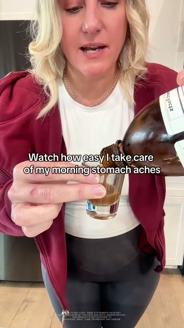 Beat 2 (0:00-0:04) — Process Teaser: This line, 'Watch how easy I take care of my morning stomach aches,' uses a Process Teaser by hinting that a simple method or routine will be revealed. It creates anticipation by promising an easy solution, prompting the viewer to stay engaged to learn the specific steps or technique.