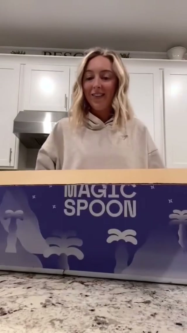 Beat 2 (0:00-0:05) — Curiosity Spike: This line uses a Curiosity Spike by showing an unexpected quantity of cereal from Magic Spoon, prompting viewers to wonder why so much was sent and what will be done with it. The phrase 'look at all the cereal that Magic Spoon just sent me' creates an immediate information gap about the context and significance of this delivery, engaging the viewer's attention.