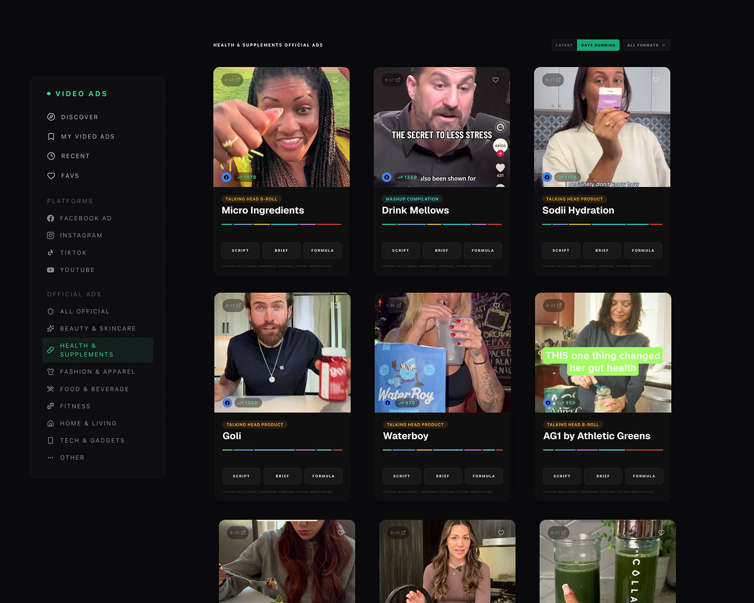 Heista sources live-running video ads from Meta Ad Library and TikTok Creative Center — the same public ad libraries competitive teams monitor. Each ad is then reverse-engineered into its structural formula by Heista's multi-agent decode pipeline. No scraping, no private data.