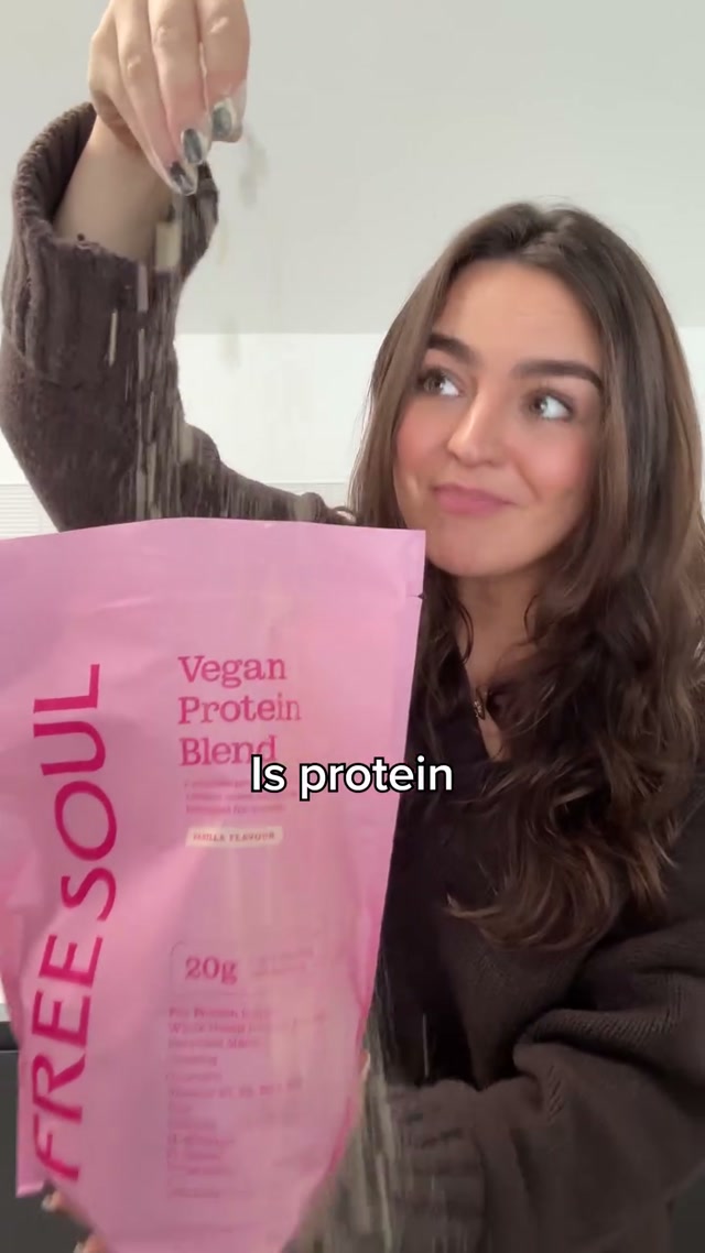 Beat 3 (0:02-0:07) — Object Intro: This beat introduces the product by contrasting typical proteins made for men with this specific protein by Free Soul made for women. The phrase 'this one by Free Soul is made specifically for women' highlights the unique selling point, focusing the viewer's attention on the product's tailored design. This moment primes the viewer to see the product as relevant and specialized for their needs.
