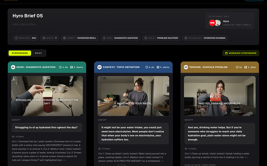 Shot-by-shot direction built from the formula. Every shot has a reason, timing, and visual direction. Hand it to a creator and they know exactly what to film.