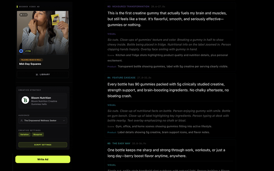 Generate script variations from the decoded formula. Your brand, your product, your voice. Running through a structure that already converts.